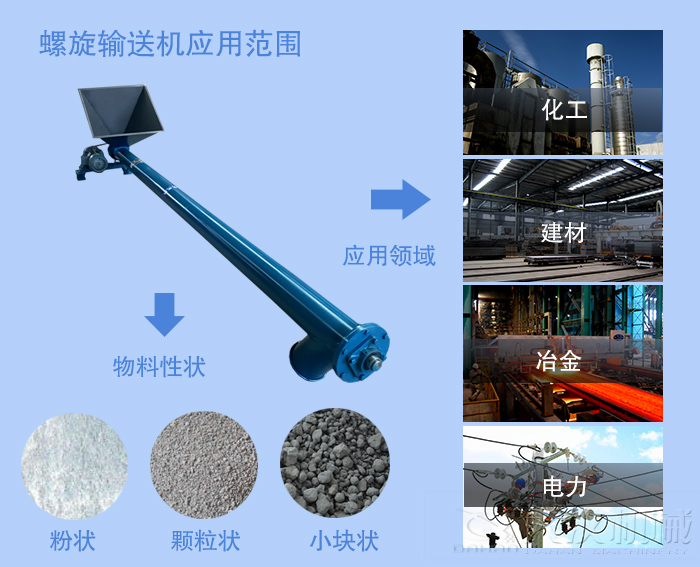 (1)螺旋輸送機(jī)是一種廣泛用于化工,建材,糧食等部門的輸送設(shè)備。 它主要用于運(yùn)輸粉狀,顆粒狀和小塊狀物料。 它不適用于輸送易于變質(zhì),黏稠和團(tuán)聚的材料。