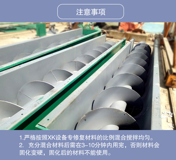 1.嚴格按照XK設(shè)備專修復(fù)材料的比例混合攪拌均勻。攪拌不均勻會出現(xiàn)局部不耐磨情況。