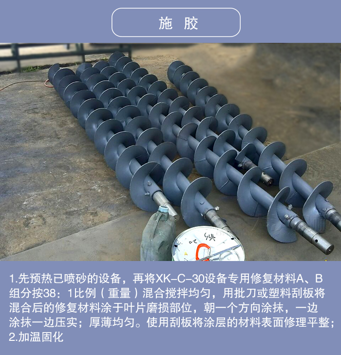 1.先預(yù)熱已噴砂的設(shè)備,再將XK-C-30設(shè)備專用修復(fù)材料A、B組分按38:1比例(重量)混合攪拌均勻,用批刀或塑料刮板將混合后的修復(fù)材料涂于葉片磨損部位,朝一個方向涂抹,一邊涂抹一邊壓實;厚薄均勻。使用刮板將涂層的材料表面修理平整;