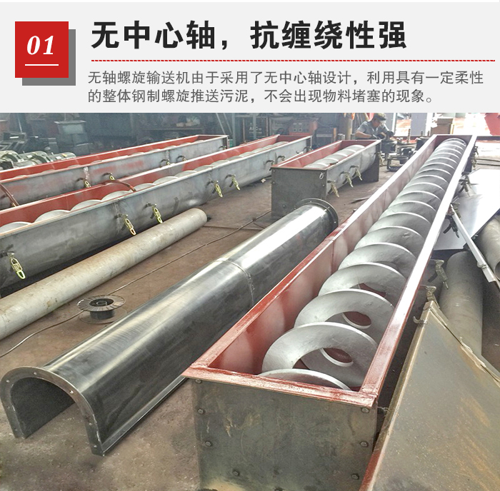 污泥中含有大量的雜質(zhì),使用傳統(tǒng)輸送機(jī)對其進(jìn)行輸送很容易出現(xiàn)堵料現(xiàn)象,嚴(yán)重影響輸送效率,無軸螺旋輸送機(jī)由于采用了無中心軸設(shè)計(jì),利用具有一定柔性的整體鋼制螺旋推送污泥,其抗纏繞性強(qiáng),不會(huì)出現(xiàn)物料堵塞的現(xiàn)象。