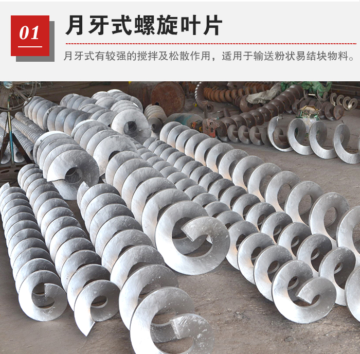 月牙式有較強的攪拌及松散作用,適用于輸送粉狀易結(jié)塊物料。