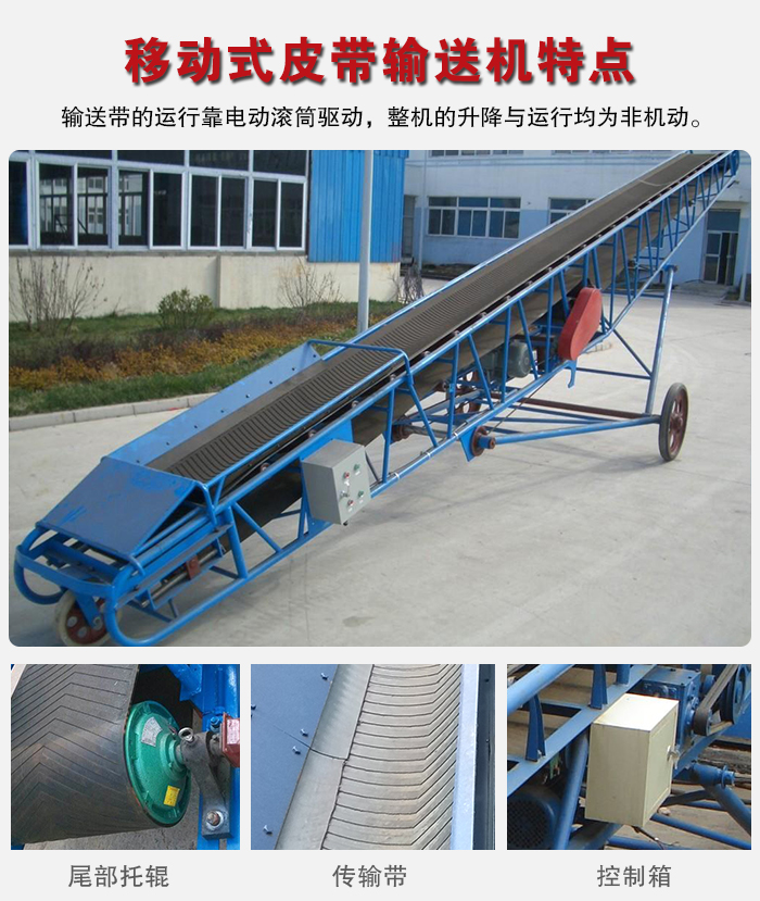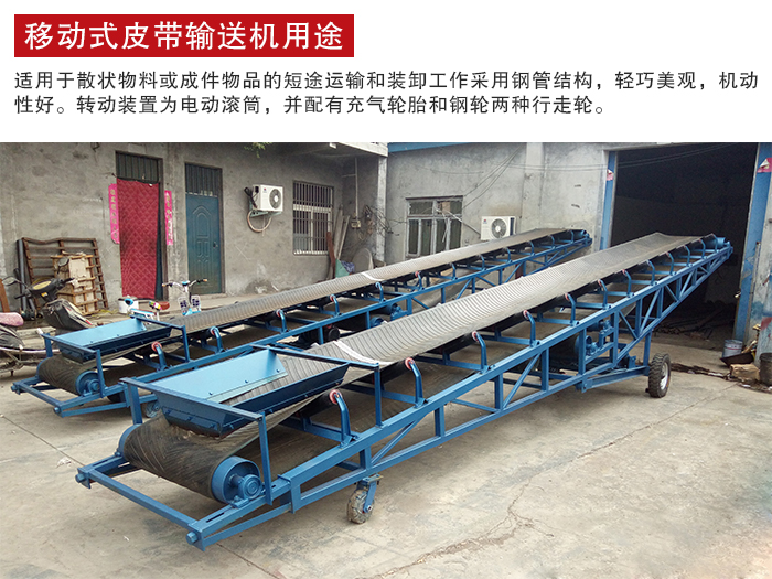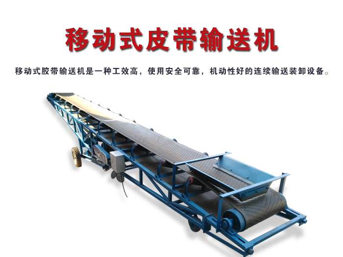 移動式皮帶輸送機是一種工效高,使用安全可靠,機動性好的連續(xù)輸送裝卸設(shè)備。主要用于裝卸地點經(jīng)常變更動的場所,如:港口、碼頭、車站、煤場、倉庫、建筑工地、沙石料場、農(nóng)場等,用來短途運輸及裝卸散料或單件重量100公斤以下的成件物品。