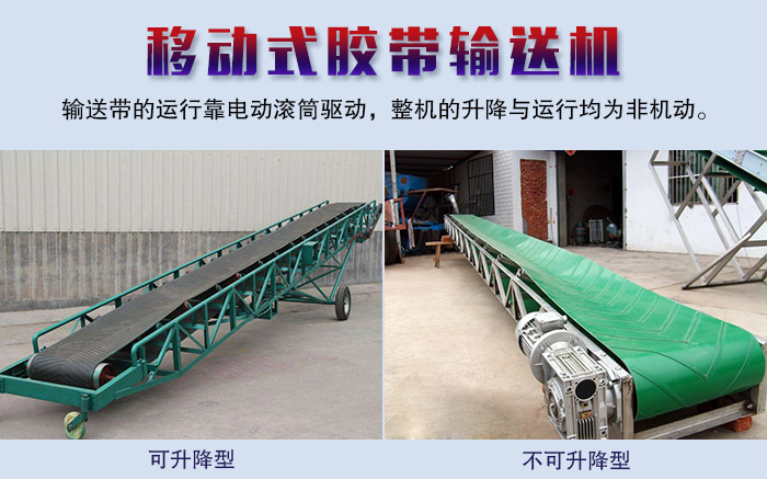 DY型移動式膠帶輸送機分為可升降型及不可升降型兩大類,輸送帶的運行靠電動滾筒驅(qū)動,整機的升降與運行均為非機動。