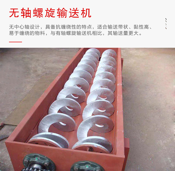 摘要:無中心軸設(shè)計(jì),具備抗纏繞性的特點(diǎn),適合輸送帶狀、黏性高、易于纏繞的物料,與有軸螺旋輸送機(jī)相比,其輸送量更大。