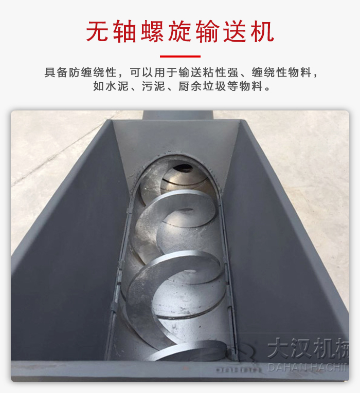無軸螺旋輸送機(jī)采用了無中心軸設(shè)計(jì),具備防纏繞性,可以用于輸送粘性強(qiáng)、纏繞性物料,如水泥、污泥、廚余垃圾等物料,可水平、傾斜輸送(傾斜角度不超過20°),大漢無軸螺旋輸送機(jī)可分為單無軸和雙無軸螺旋輸送機(jī),還可根據(jù)輸送物料及應(yīng)用場合分為碳鋼、不銹鋼材質(zhì)。