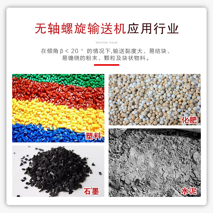 無軸螺旋輸送機(jī)廣泛用于食品、醫(yī)藥、化工、 建筑等部門,在傾角β< 20 °的情況下,輸送黏度大、易結(jié)塊、易纏繞的粉末、顆粒及塊狀物料。