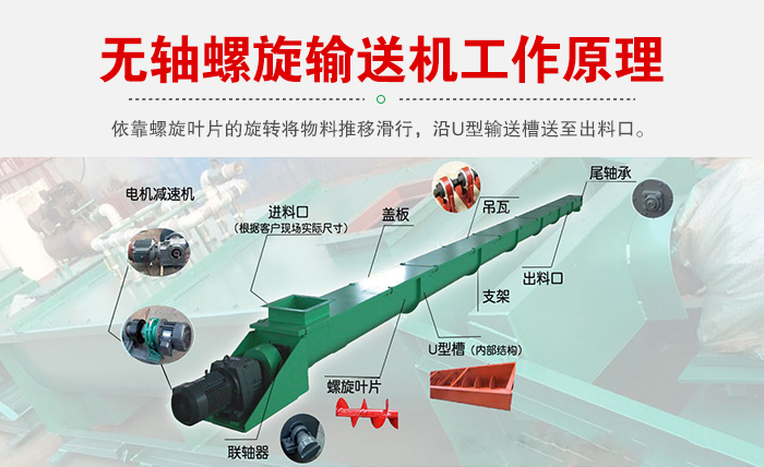 無軸螺旋輸送機(jī)由驅(qū)動機(jī)構(gòu)(電機(jī)減速機(jī)、傳動軸)、U型槽與支架、無軸螺旋、襯條、蓋板、進(jìn)料口、出料口、緊固件等部件組成。當(dāng)物料從輸送機(jī)的進(jìn)料口進(jìn)入,依靠螺旋葉片的旋轉(zhuǎn)將物料推移滑行,沿U型輸送槽送至出料口,并與壓榨機(jī)或垃圾小車配套,將物料進(jìn)行下一步處理。