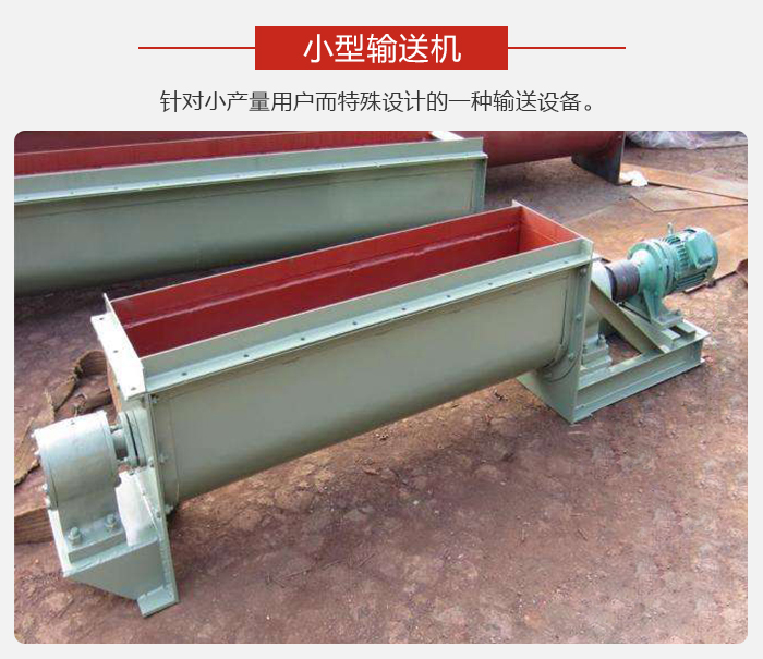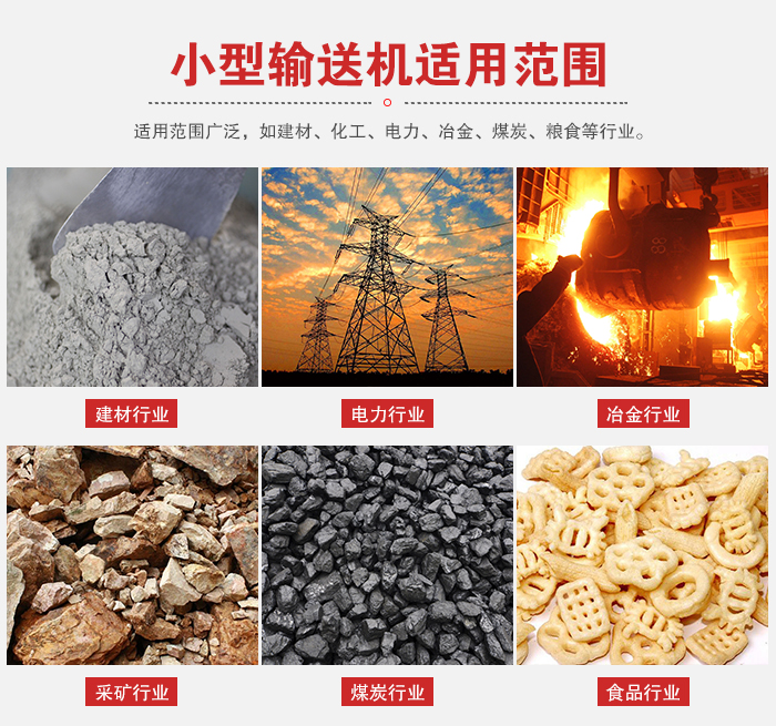 小型輸送機(jī)適用范圍廣泛,如建材、化工、電力、冶金、煤炭、糧食等行業(yè),適用于水平或傾斜輸送粉狀、粒狀和小塊狀物料,如煤、灰、渣、水泥、糧食等。